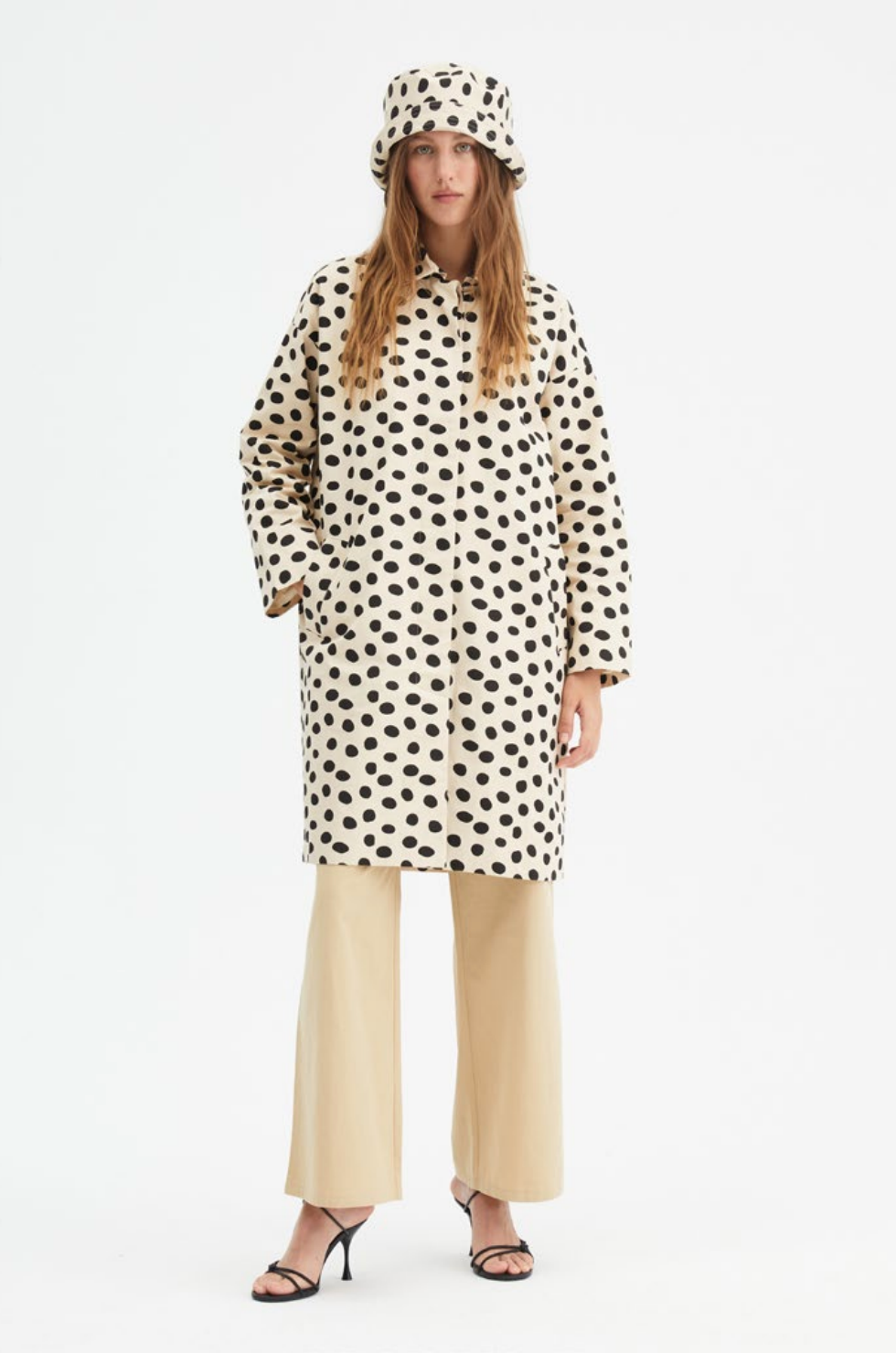 Polka dot twill cotton straight-cut trench coat, with lapel collar, long sleeves, front buttons, and front pockets.
